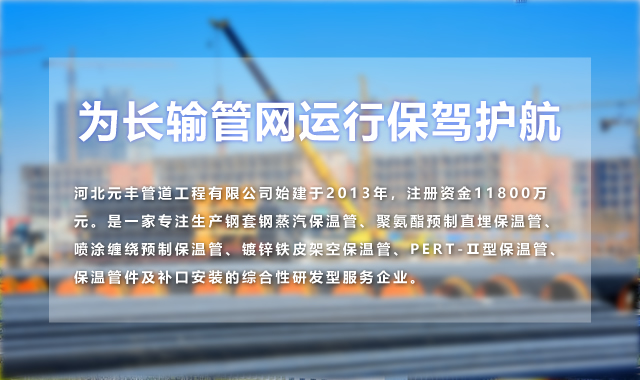 河北元豐管道工程有限公司始建于2013年,注冊資金11800萬元。是一家專注生產(chǎn)鋼套鋼蒸汽保溫管、聚氨酯預制直埋保溫管、噴涂纏繞預制保溫管、鍍鋅鐵皮架空保溫管、PERT-Ⅱ型保溫管、保溫管件及補口安裝的綜合性研發(fā)型服務企業(yè)。